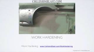 Work hardening occurs when metal is repeatedly bent or shaped, increasing its stiffness and brittleness. Vehicle panels have some built-in work hardening from the factory due to body lines and curves. Collision damage adds to this, making reshaping more difficult and increasing the risk of cracking.